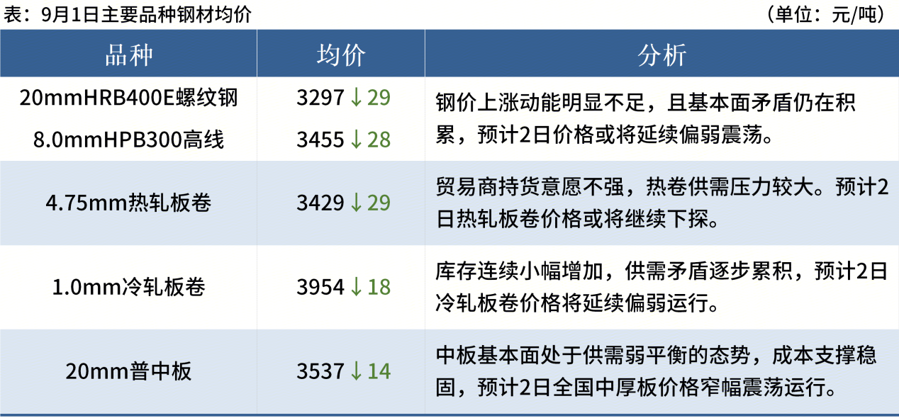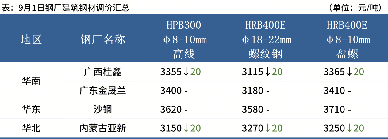 ◎ 9月1日,沙鋼出臺9月上旬出廠價,螺紋鋼、線材、盤螺價格持平,現(xiàn)螺紋鋼3550元/噸,盤螺3710元/噸。